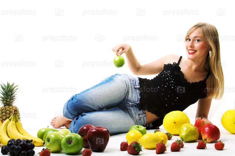 Девушка с яблоком на белом фоне в окружении фруктов