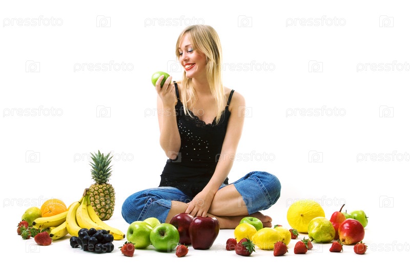 Девушка с яблоком на белом фоне в окружении фруктов