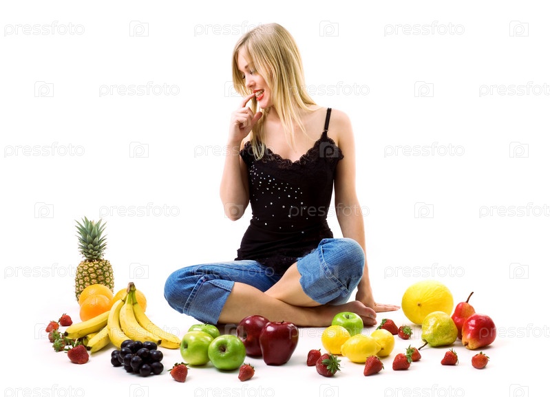 Девушка на белом фоне в окружении фруктов