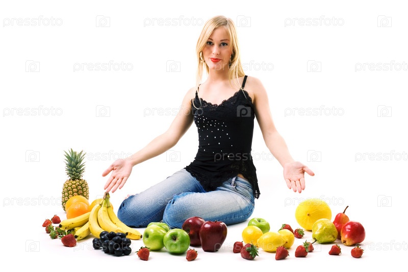 Девушка на белом фоне в окружении фруктов