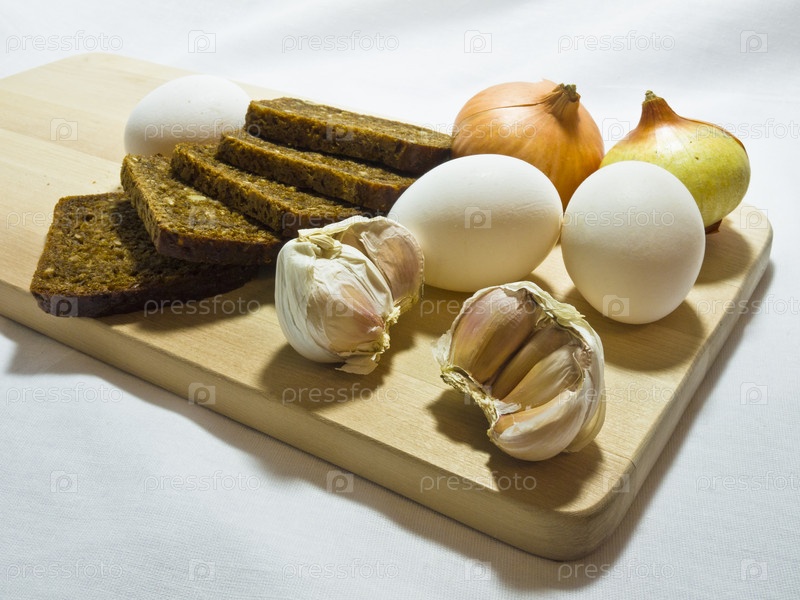 Хлеб, яйца, лук и чеснок на деревянной доске