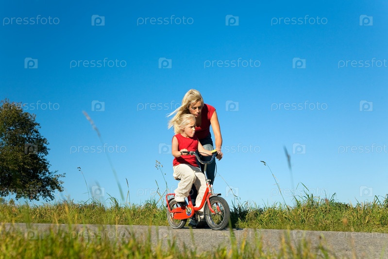 Мама учит дочь кататься на велосипеде