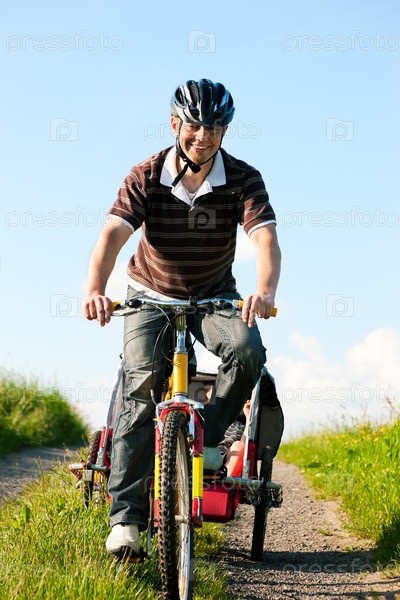Отец везет сына на велосипедном трейлере