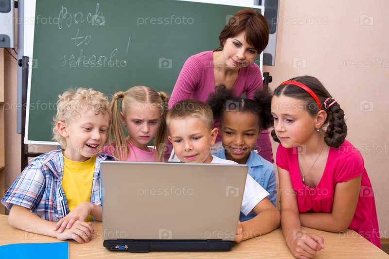 Портрет учеников, смотрящих на ноутбук с учителем рядом
