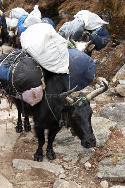 Грузовые перевозки на якутах в поход Эвереста, Гималаи, Непал