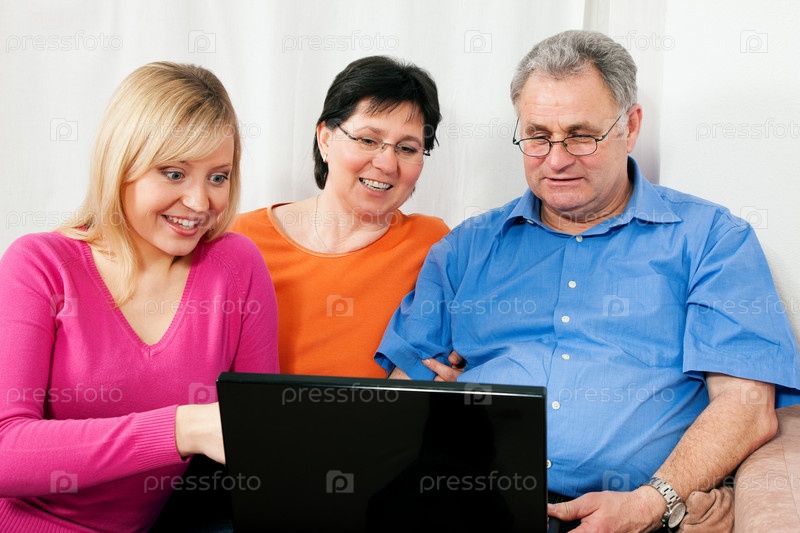Дочь объясняет пожилым родителям как работать с ноутбуком