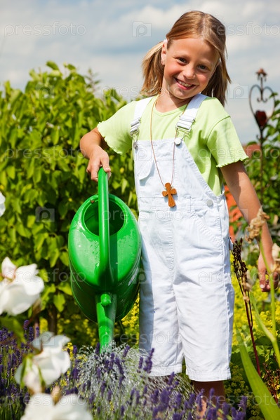 Девочка, поливающая цветы в саду