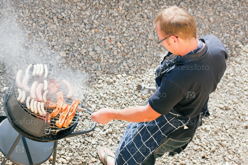 Мужчина жарит мясо на гриле