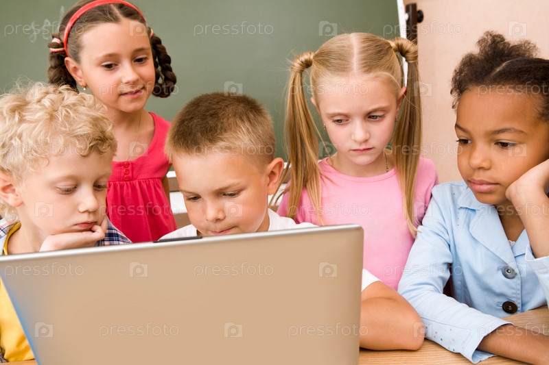 Портрет серьезных детей, работающих с ноутбуком во время урока