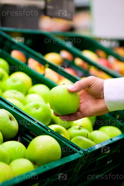 Яблоко в руке в супермаркете