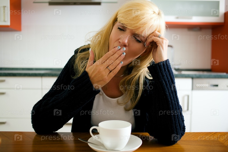 Женщина за столом пьет утренний кофе