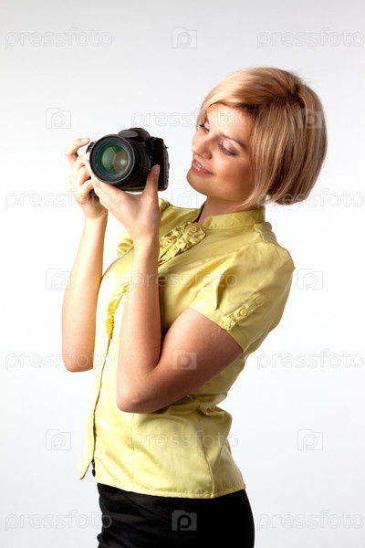 Девушка с фотоаппаратом на белом фоне