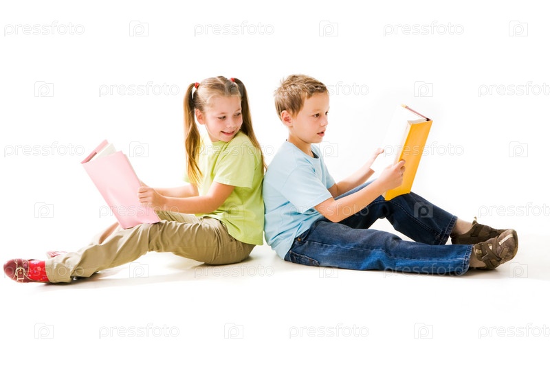 Портрет милых школьников, держащих открытые книги и читающих их