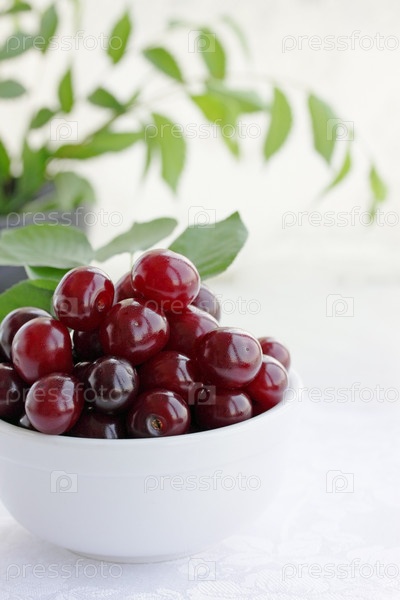 Чаша со спелой вишней на фоне зеленых листьев растения