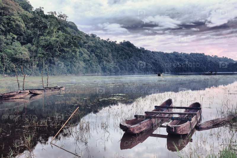 Лодки у берега озера Тамблинган на рассвете, Бали