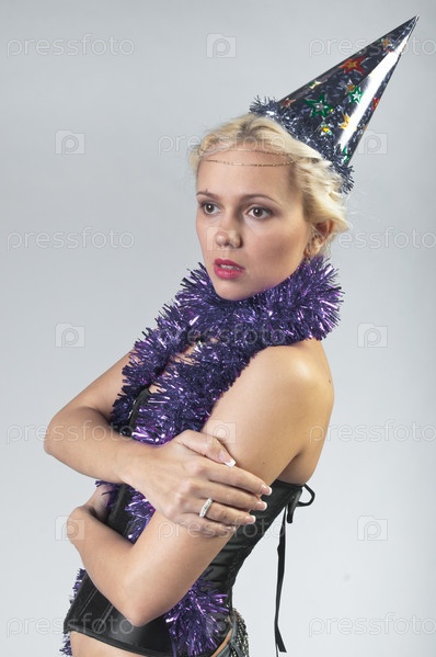 Девушка в праздничном колпаке и мишуре