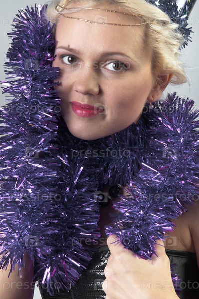Девушка в праздничном колпаке и мишуре