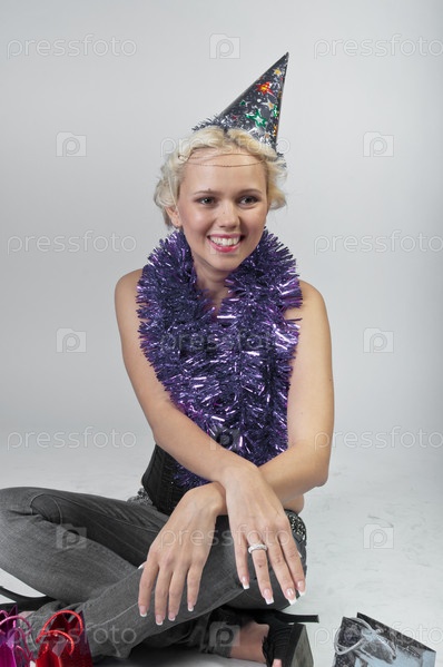 Девушка в праздничном колпаке и мишуре в окружении подарков