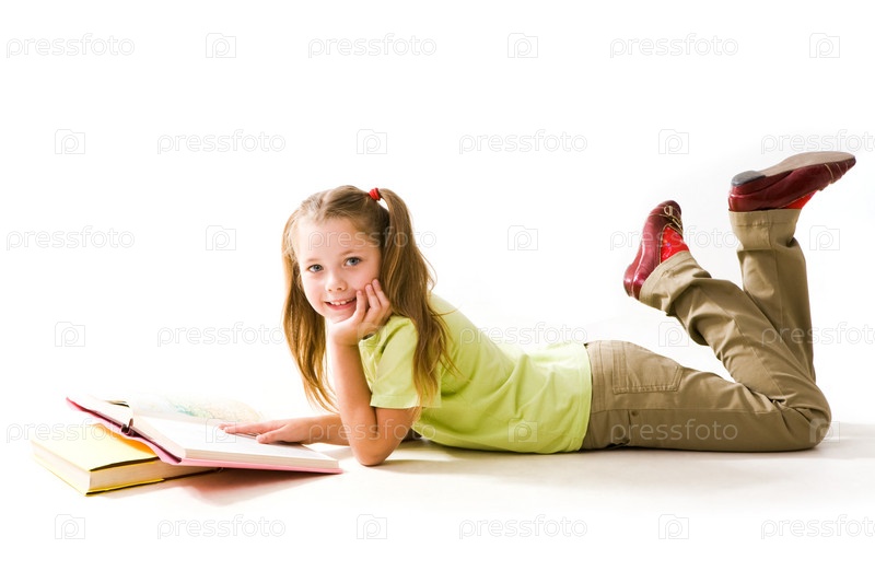 Портрет симпатичной школьницы, держащей руку на открытой книге и смотрящей в камеру