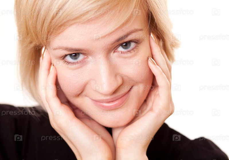 Близкий снимок лица молодой красивой улыбающейся счастливой женщины на белом фоне