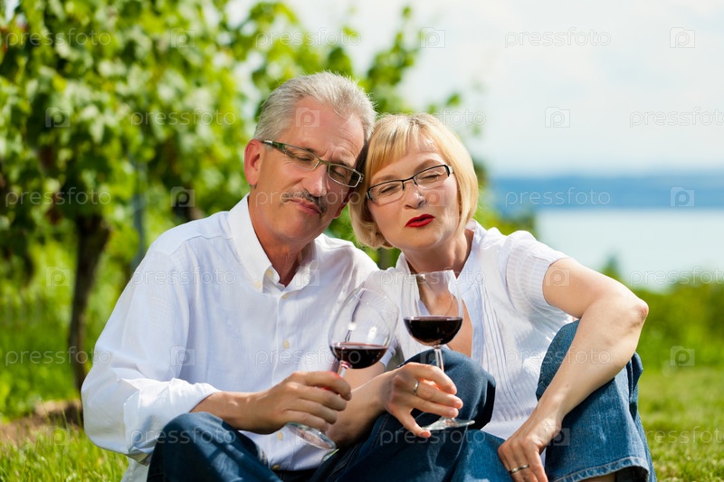 Пожилая пара пьет вино на природе