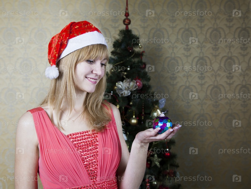 Молодая девушка держит новогоднюю игрушку