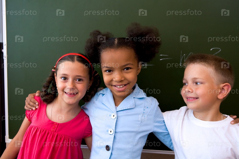 Изображение умных одноклассников, стоящих у доски и улыбающихся на камеру