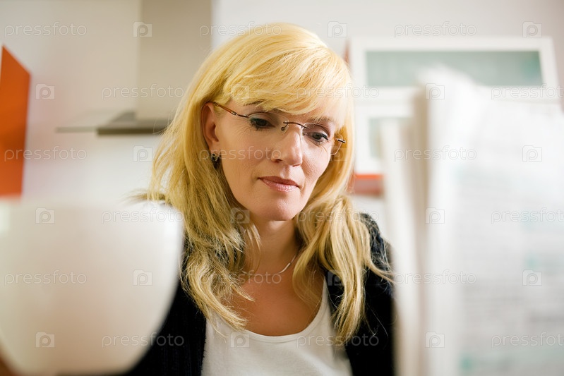 Женщина за завтраком читает газету