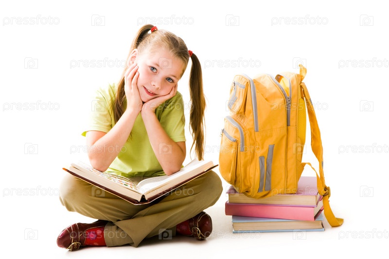 Портрет симпатичной школьницы с открытой книгой, глядящей в камеру на белом фоне