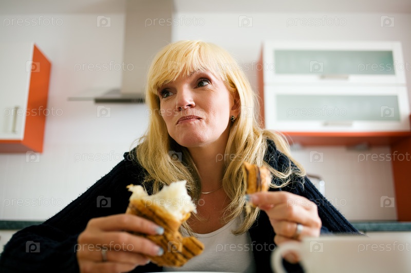 Женщина за столом завтракает