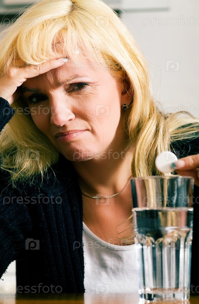 Женщина с головной болью бросает быстрорастворимую таблетку в воду