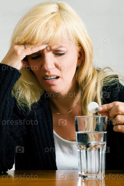 Женщина с головной болью бросает быстрорастворимую таблетку в воду