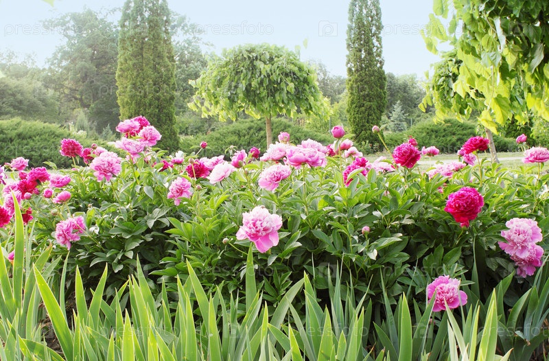 Клумба с красными и розовыми пионами