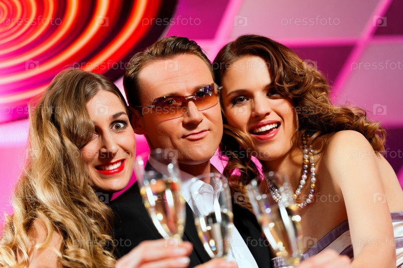 Мужчина и две женщины с бокалами шампанского в руках