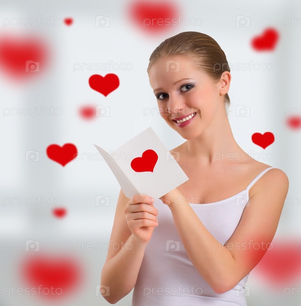 Счастливая девушка с любовной открыткой в окружении сердечек
