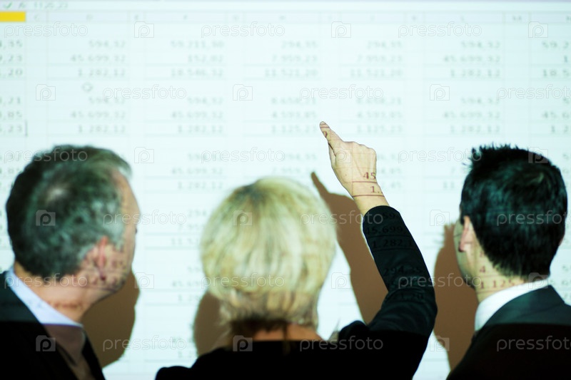 Деловые люди стоят у таблицы с данными и обсуждают их