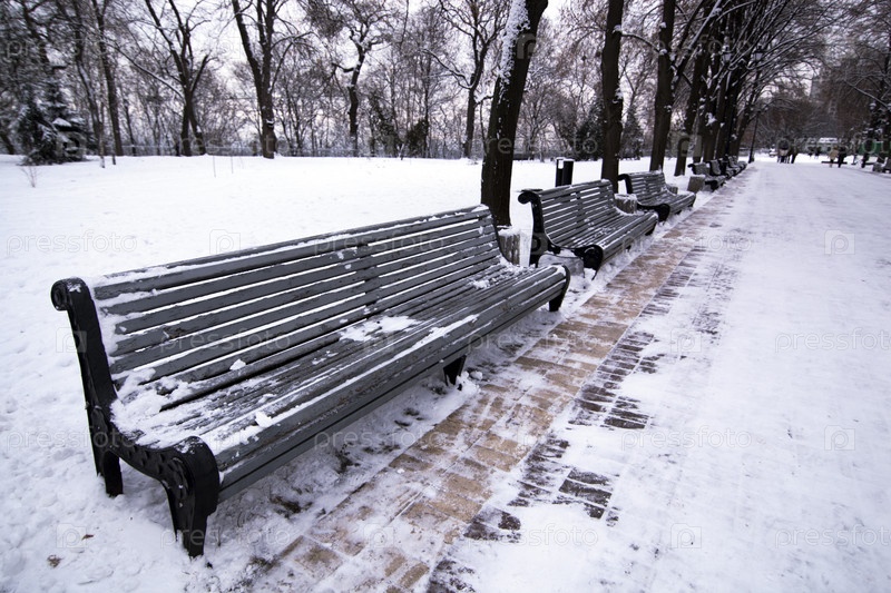 Проспект в зимнем парке со скамейками и снегом