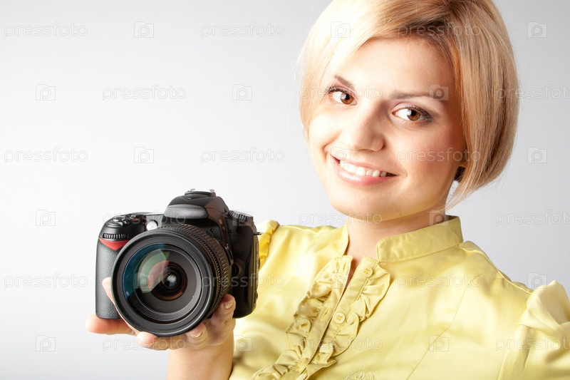 Красивая улыбающаяся женщина с фотоаппаратом в руке на сером фоне