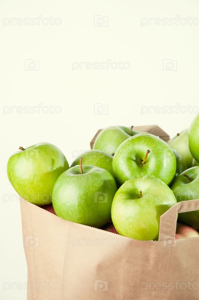 Бакалейный бумажный пакет полный зеленых яблок