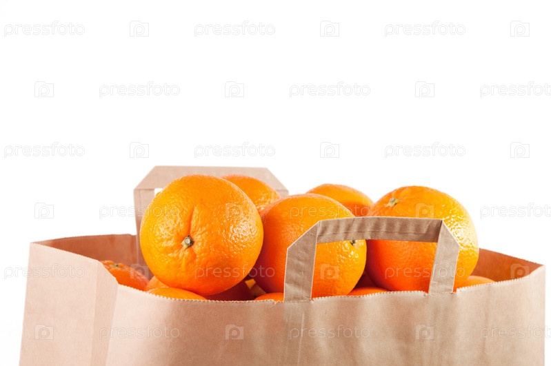Бумажный пакет со спелыми апельсинами, белый фон