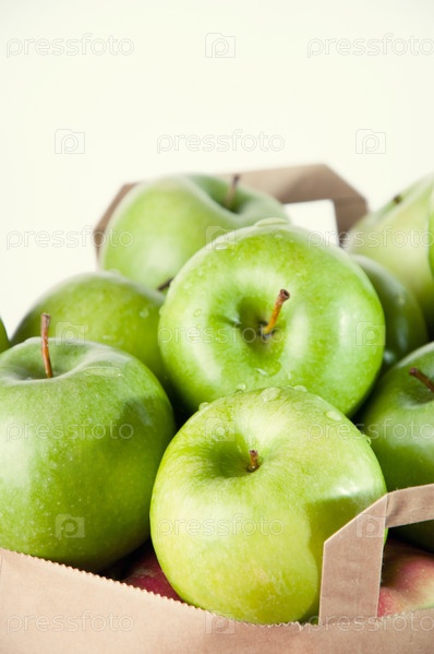 Крупным планом свежие зеленые яблоки в бумажном пакете