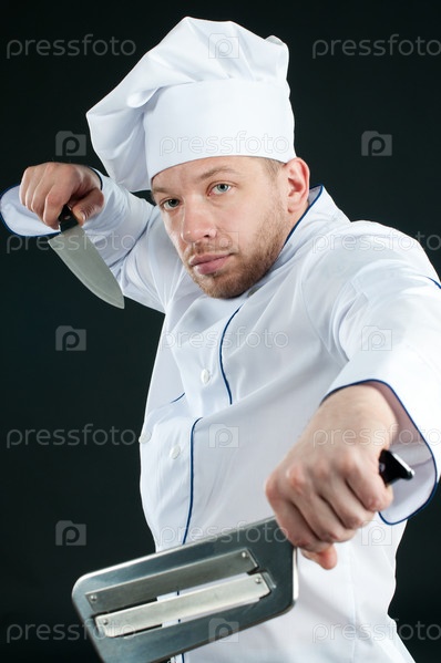 Шеф-повар, позирующий с ножами в руках