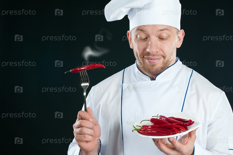 Шеф-повар с тарелкой перцев чили на темном фоне