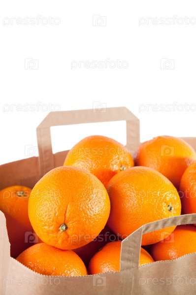Свежие апельсины в бумажном пакете, изолированные на белом фоне