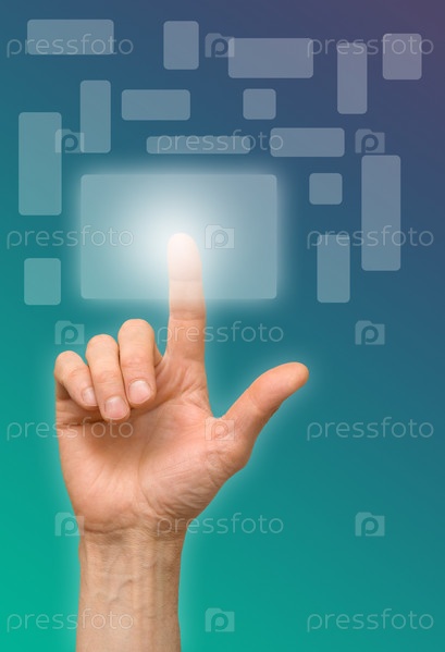 Рука нажимает кнопку сенсорного экрана на голубом фоне