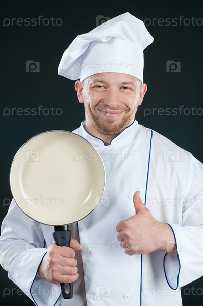 Веселый повар со сковородкой показывает жест ОК