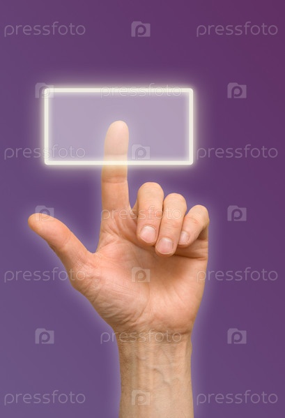 Рука нажимает кнопку сенсорного экрана на фиолетовом фоне