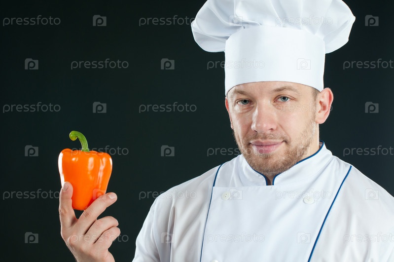 Шеф-повар с болгарским перцем в руках, темный фон