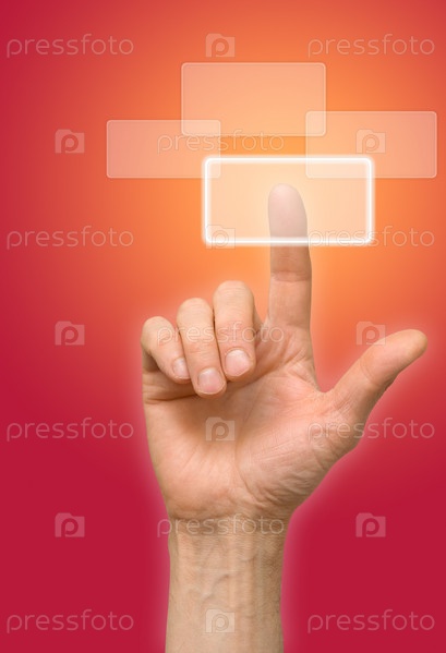 Рука нажимает кнопку сенсорного экрана на красно-оранжевом фоне