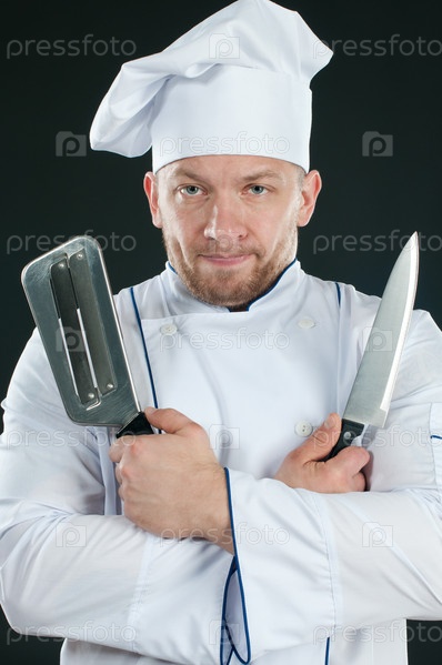 Шеф-повар с ножами в руках, темный фон